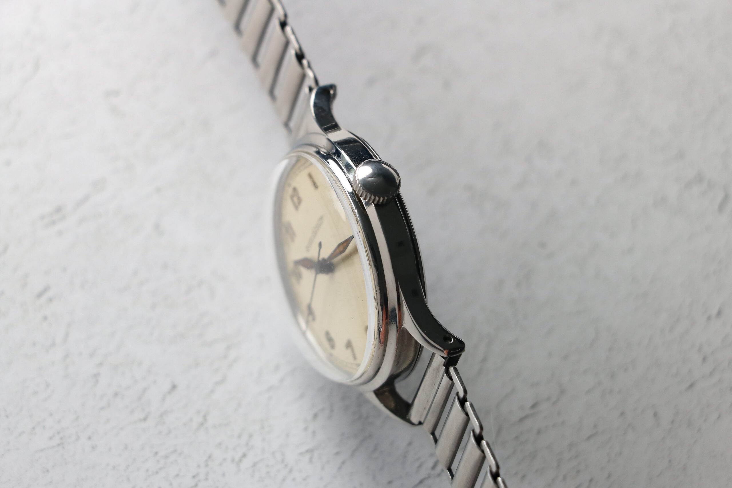 From the Polaris to the Reverso, Jaeger-LeCoultre has produced legendary watches and provided movements to legendary watchmakers – Audemars Piguet and Vacheron Constantin to name two. Here we have a nicely preserved gents Jaeger-LeCoultre wrist watch in stainless steel from the 1940’s. The case is full and thick, in good condition displaying wear commensurate with age and measures 33.75mm excluding the unsigned crown. Factory finished original silver dial with vertical brushing and light cream patina. Small blemishes between 10 and 11, just above 5 and at 3 at the outer edge. Arabic indices in radium lume. Original blued steel sword hands and subsidiary seconds. Inner railroad style minute track. Triple signed on dial, case and movement.