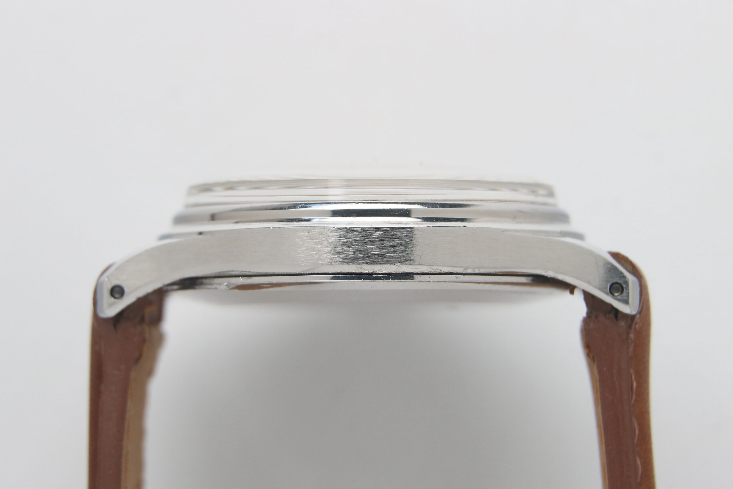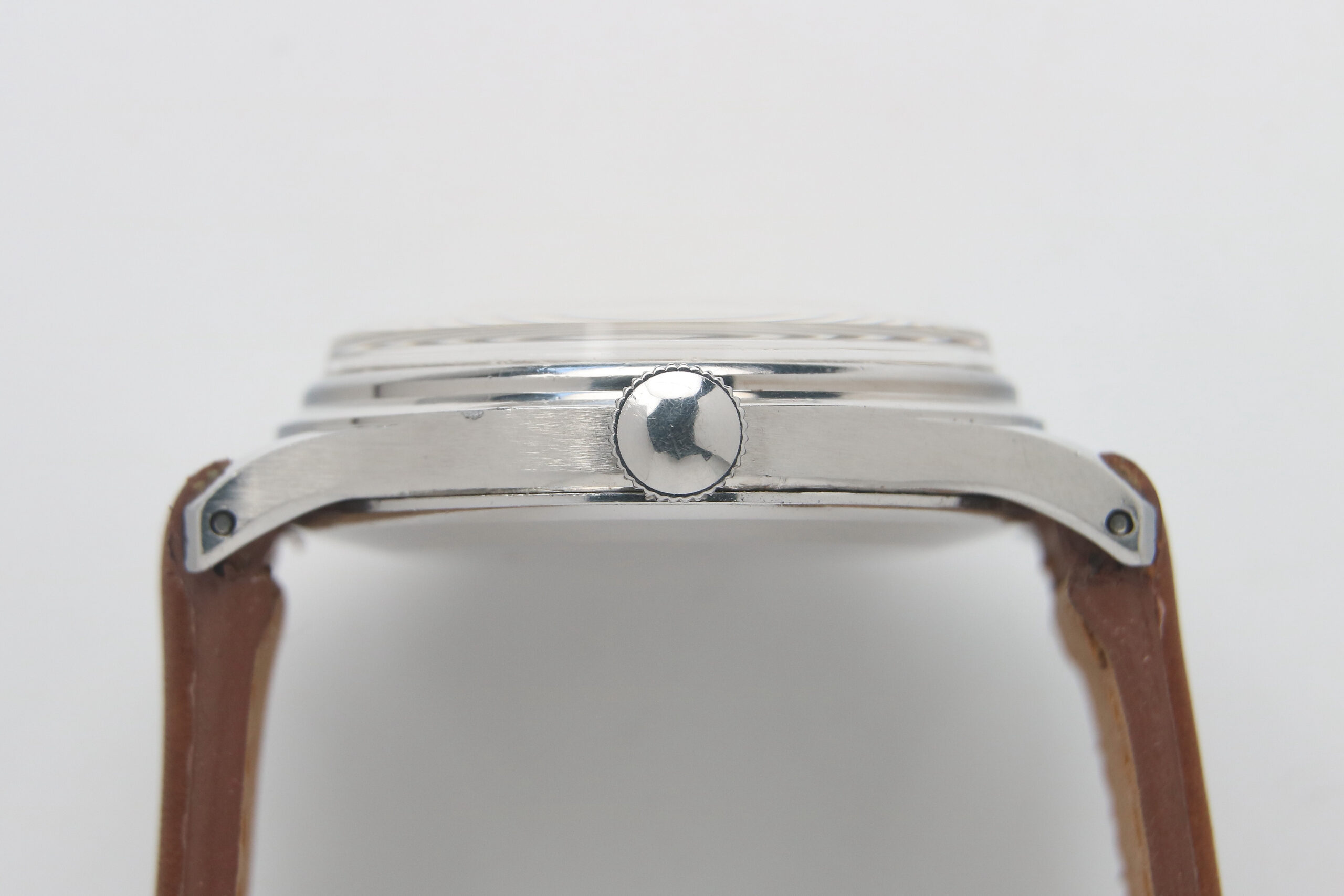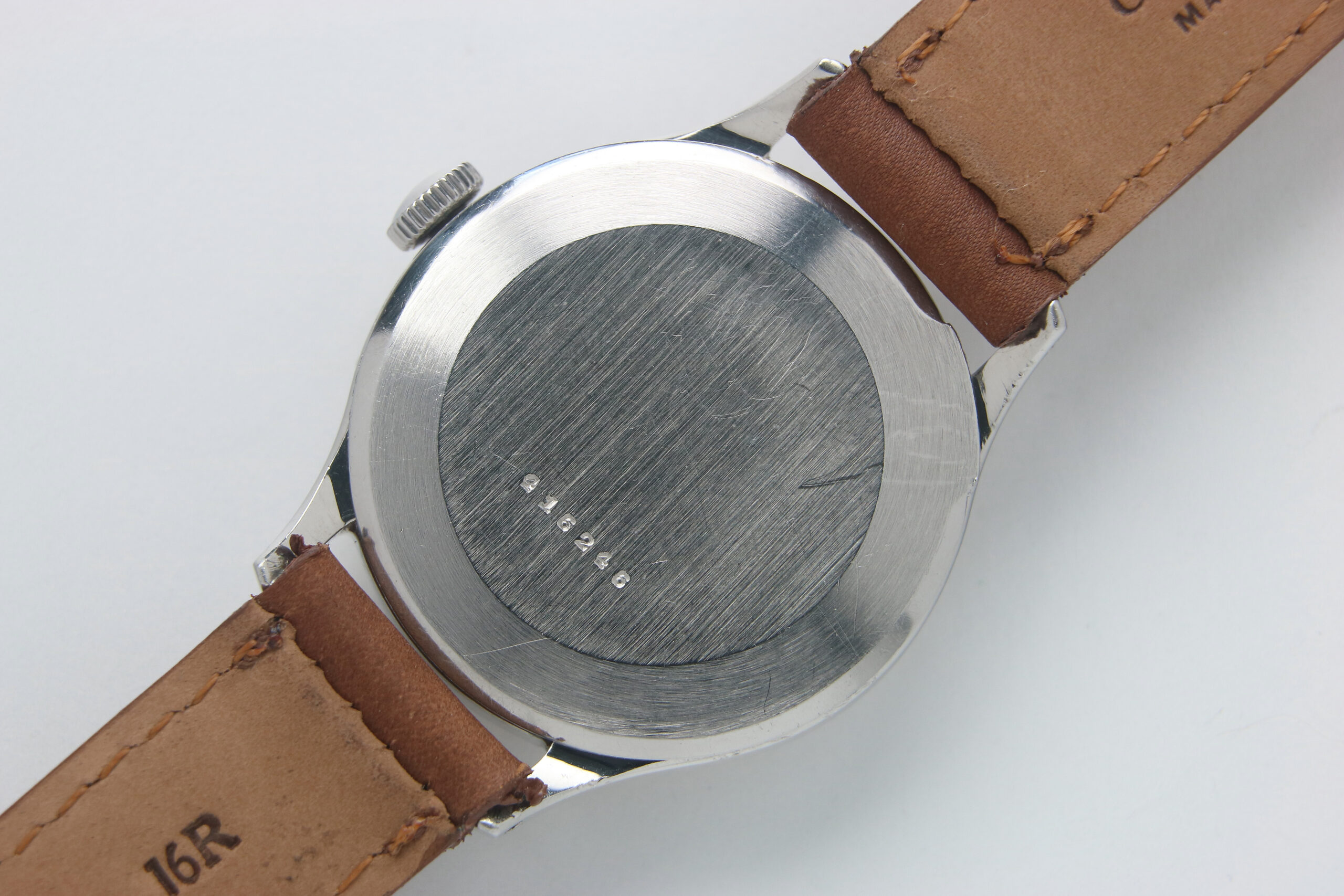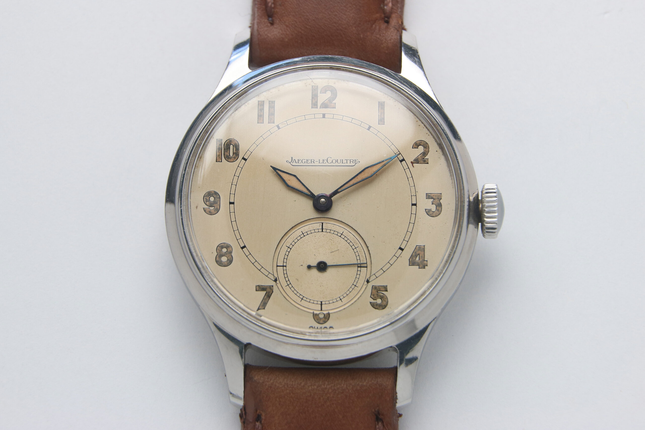 A well preserved gents Jaeger-LeCoultre wrist watch from the 1940’s.  These watches are rarely found in this condition.  Unpolished stainless steel case in excellent condition measuring 33.75mm excluding the original unsigned crown.  Factory finished original silver dial with vertical brushing and light cream patina.  Arabic indices in radium lume.  Original blued steel sword hands and subsidiary seconds.  Inner railroad style minute track.  Triple signed on dial, case and movement.