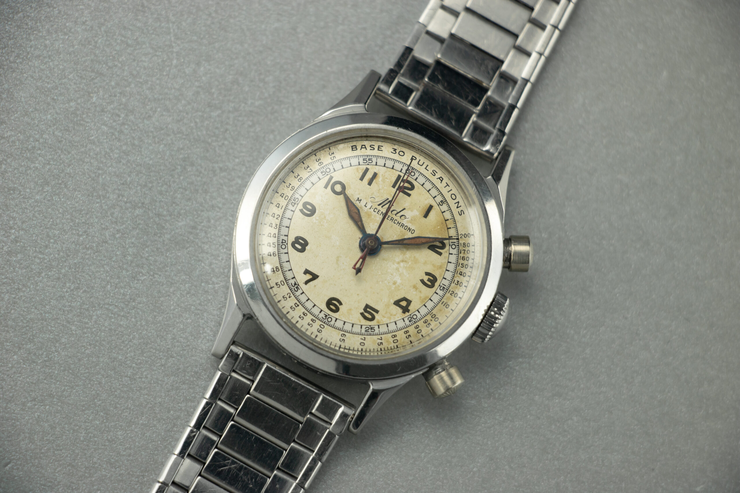 A gents Mido Multi-Centerchrono with original two-tone pulsometer dial on a vintage Mido stainless steel bracelet, circa 1940’s.  Mido produced the Multi-Centerchrono in the 1940’s with several different dial configurations including white, black and copper.  The pulsometer variation seen here is uncommon, as the vast majority of these watches are found with a telemeter/tachymeter combination dial.  The stainless steel case measures 35mm and was made by case maker Taubert et Fils, who also manufactured the cases of some of Patek Philippe’s most iconic chronographs.  The signature ribbed pushers seen here were the exact type used on Patek Philippes’ first waterproof chronograph, the ref. 1463.  Case displays moderate wear commensurate with age throughout.  Original unsigned crown.  Pushers display wear and two very small dings as seen in photos.  Screw down case back with inner dust cover.  Overall wear commensurate with age.  Blued steel dagger hands with red and blue chronograph hands.  Radium filled arabic hour markers.  Dial displays mottled cream patina.  Tachymeter, telemeter, second track in white.