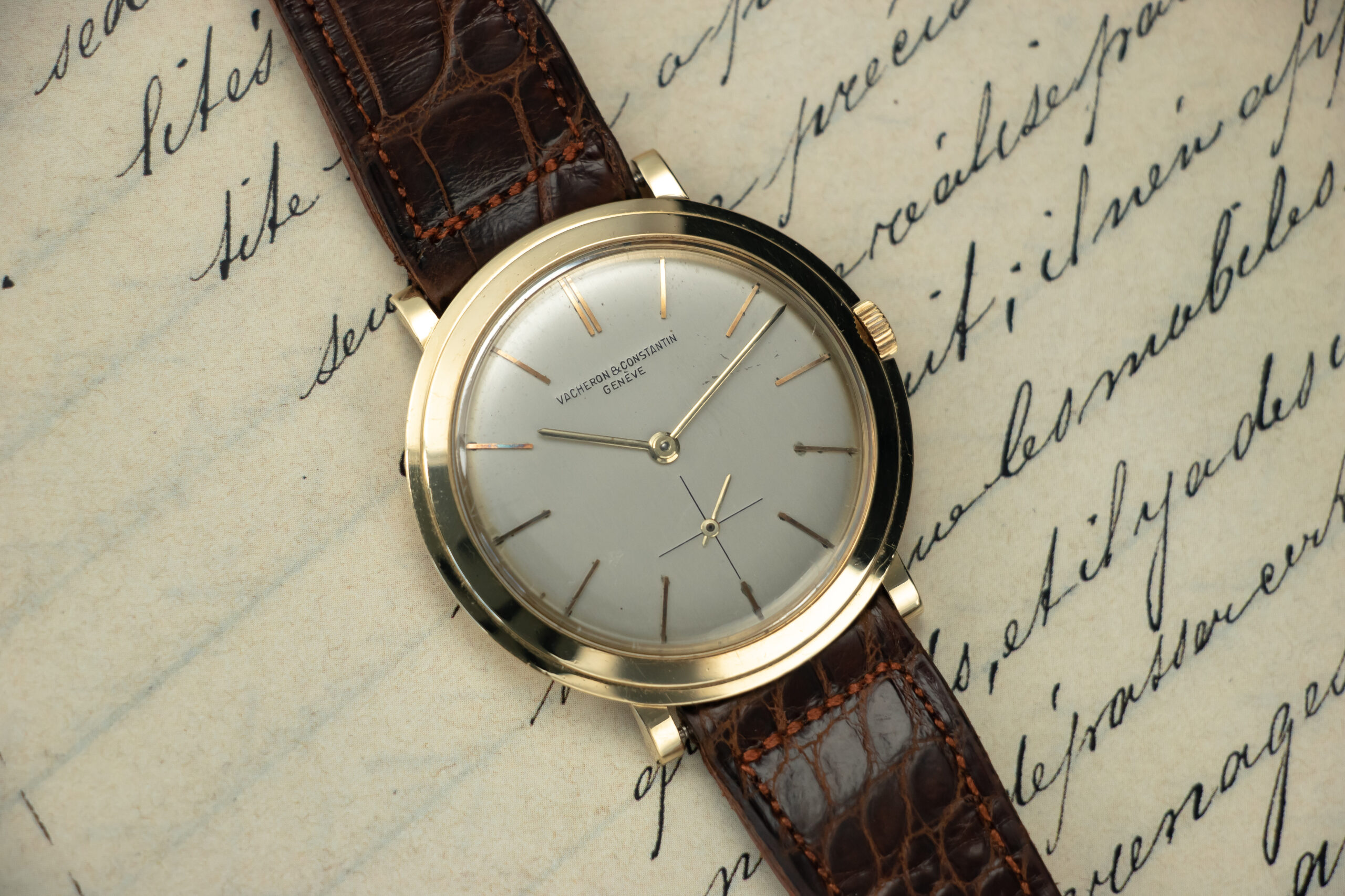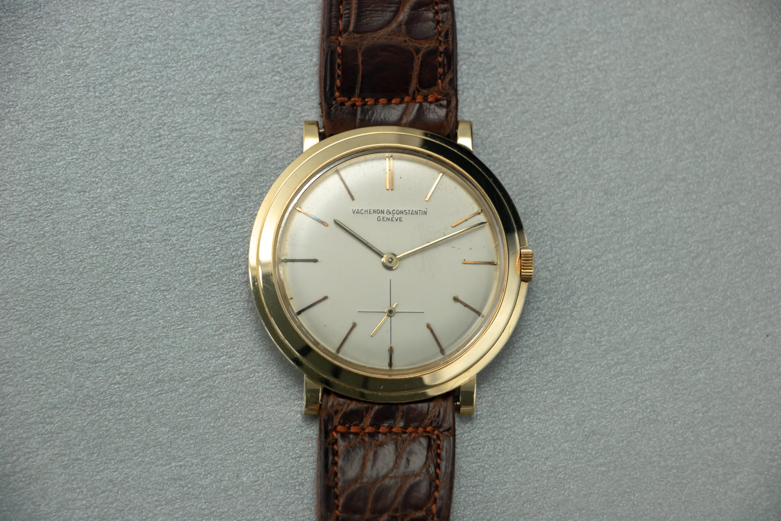 A fine and rare gents Vacheron Constantin ref. 6006 wrist watch in yellow gold, circa 1950-1955. The boldly styled “disco volante” case remains in very good condition, featuring a stepped bezel and measuring 34.5mm excluding the original unsigned crown. Collectors of of this time period will note that Vacheron produced a watch in no more than 24 examples of any one configuration. The original silver dial is affixed with applied elongated gold bars and the original gold baton hour and minute hands are present, as well as subsidiary seconds. Signed “VACHERON & CONSTANTIN”, “GENEVE”.