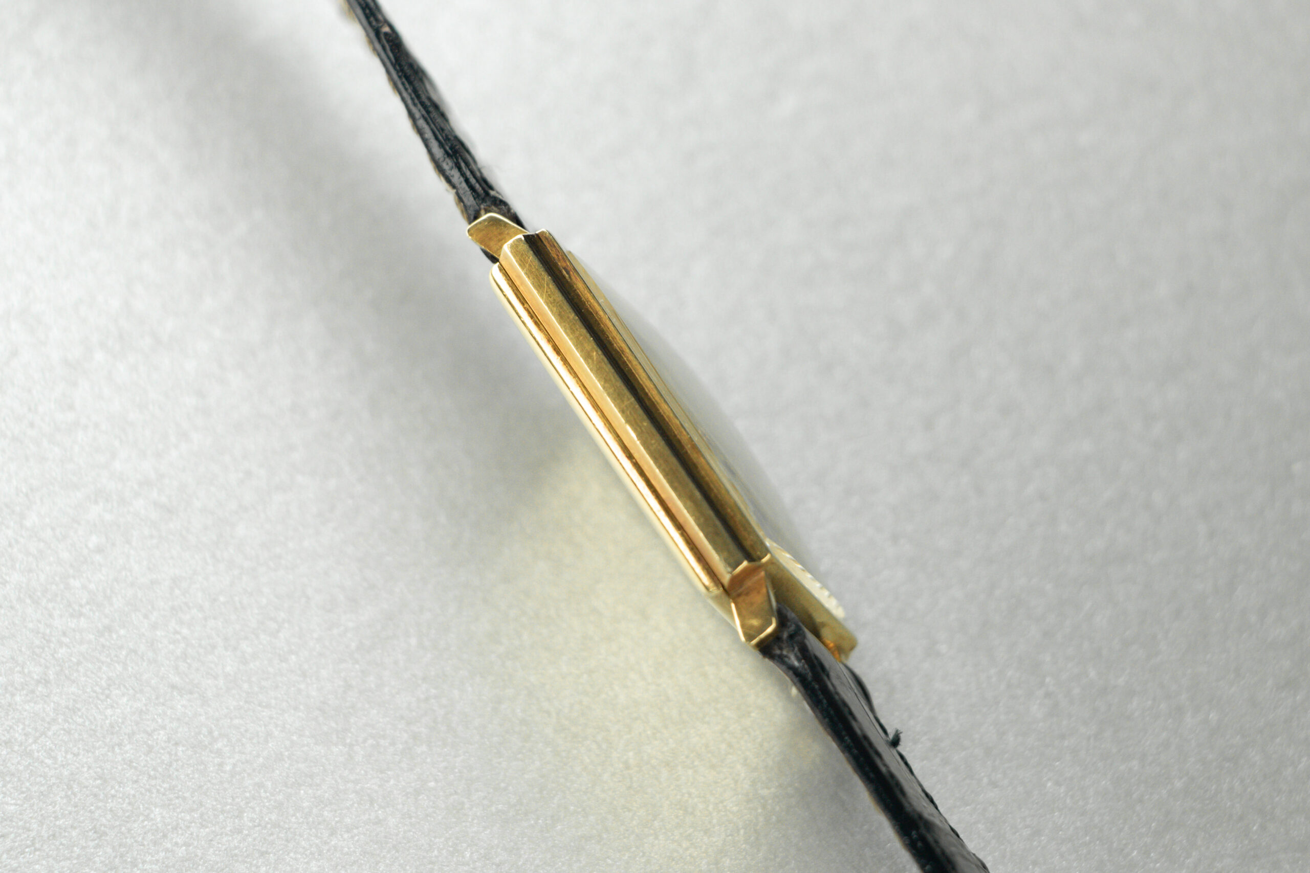 A fine and very rare gents rectangular Audemars Piguet wristwatch in yellow gold, circa 1953. 1953 was a special year for Audemars Piguet as it marked the arrival of design legend Gerald Genta. Genta went on to design every Audemars Piguet wristwatch produced from 1953 until the release of the Royal Oak two decades later. The rectangular 18kt yellow gold case measures 26mm wide excluding the crown by 27mm high and 34.5mm lug to lug, with stepped sides featuring a brushed finish. The case is unpolished with its original finishes intact and displays minor wear throughout. Factory original silver dial with elongated deco style applied gold bars with attractive rainbow age toning marking the hours and original gold baton hands. Minor aging to outside edges and bottom left corner. Signed “AUDEMARS, PIGUET”, “GENEVE”, “SWISS”.