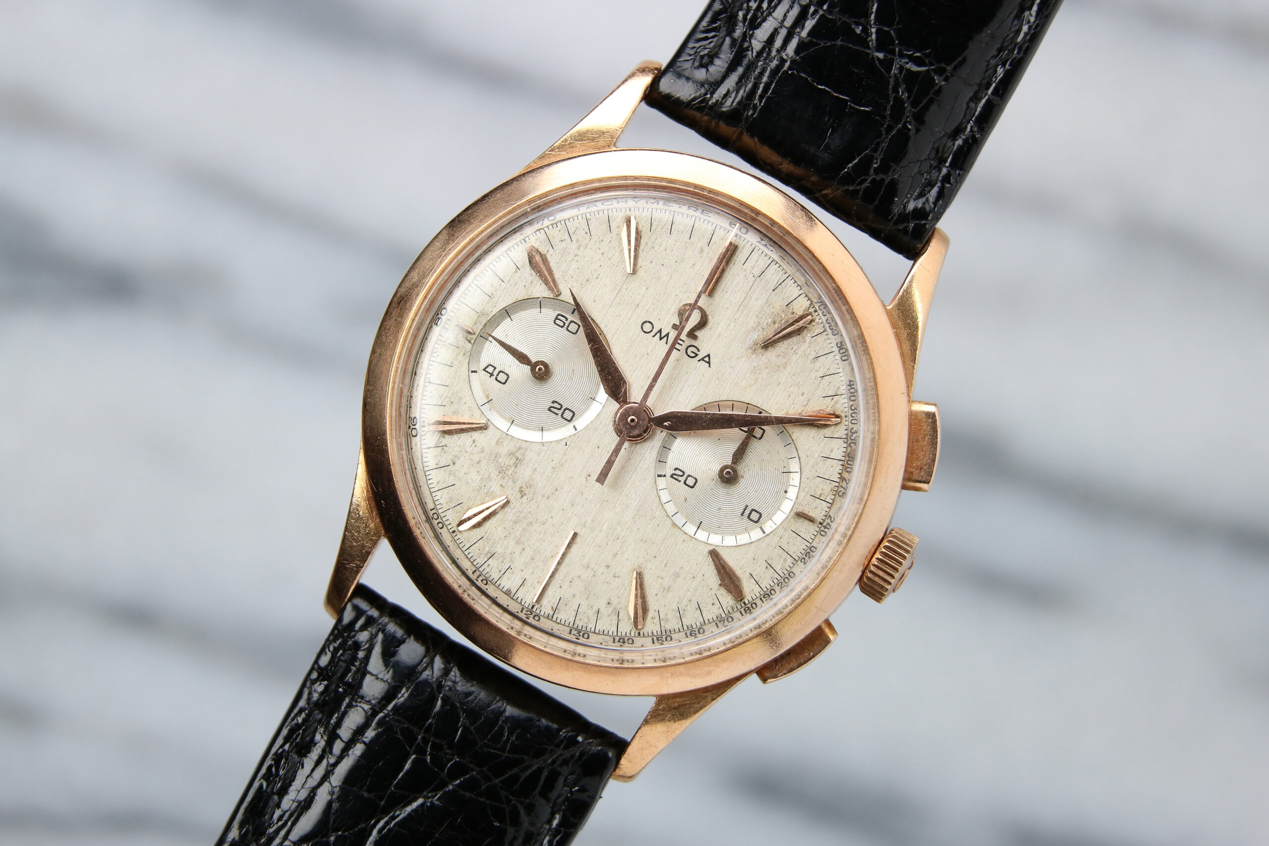 A gents Omega 2872 wrist chronograph dating to 1958. More commonly found cased in yellow gold, this example features a solid 18kt rose gold snap back case measuring 34.5mm excluding the signed crown. Rectangular pushers control chronograph functions. Original factory finished two tone silver dial with vertical brushing and inset sub dials. Outer tachymeter scale. Applied rose gold indices and hands. Signed on case, dial, crown and movement.