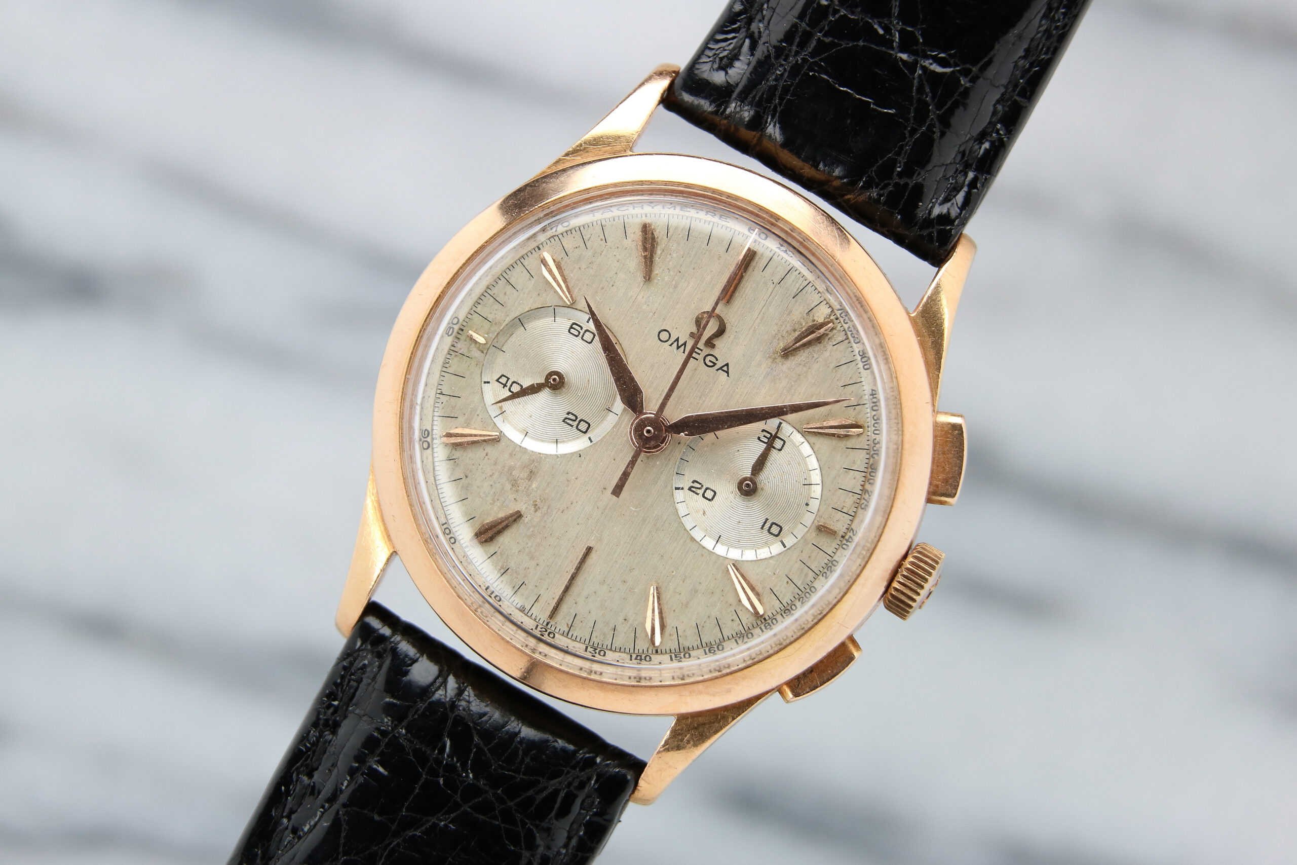 A gents Omega 2872 wrist chronograph dating to 1958. More commonly found cased in yellow gold, this example features a solid 18kt rose gold snap back case measuring 34.5mm excluding the signed crown. Rectangular pushers control chronograph functions. Original factory finished two tone silver dial with vertical brushing and inset sub dials. Outer tachymeter scale. Applied rose gold indices and hands. Signed on case, dial, crown and movement.