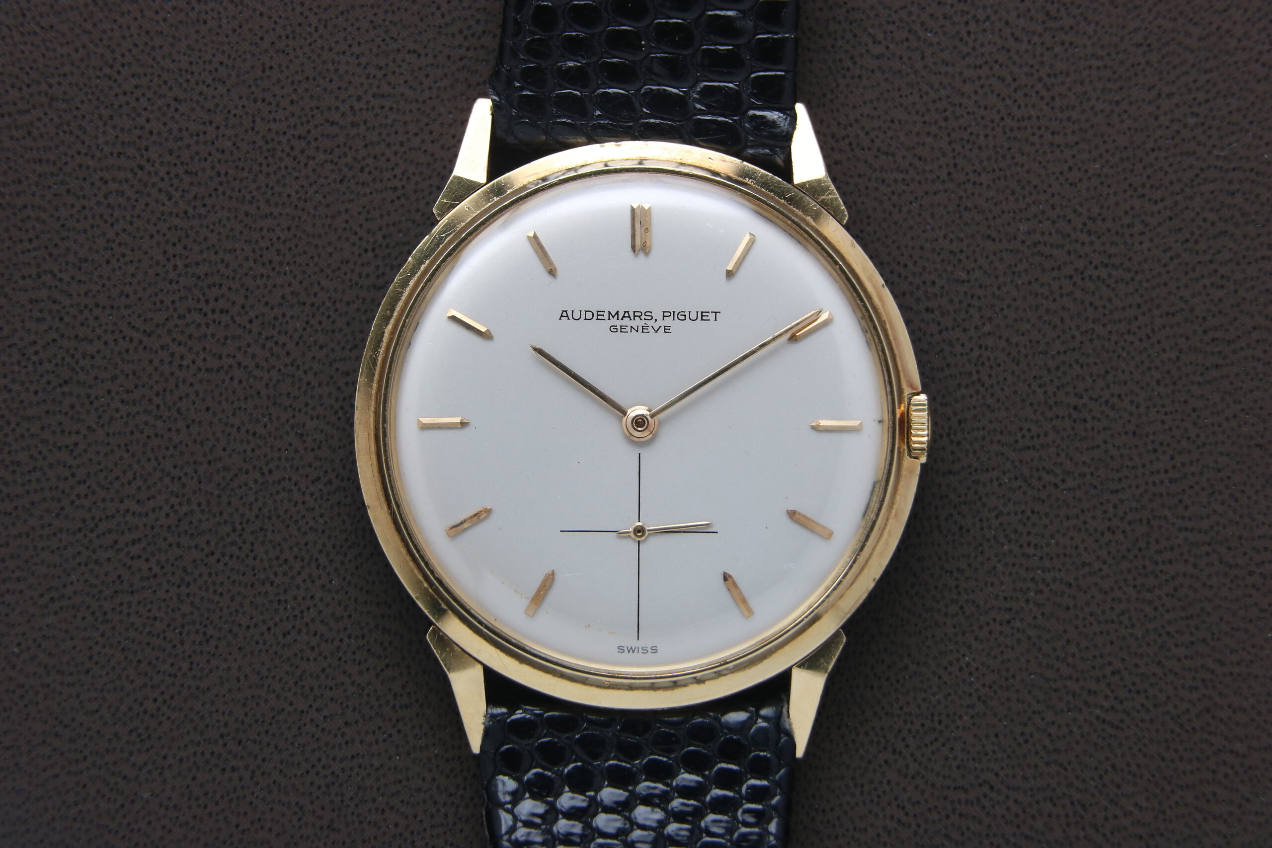 A stunning mid century gents Audemars Piguet in 18kt yellow gold. Beautifully preserved unpolished case with factory polished lug tops and brushed sides measuring 33.65mm excluding the original crown. Factory original silvered dial with applied gold markers and original stick hands. A small blemish can be found at the edge of the dial between 3 and 4 o’clock. Subsidiary seconds. Original signed 18kt yellow gold buckle.