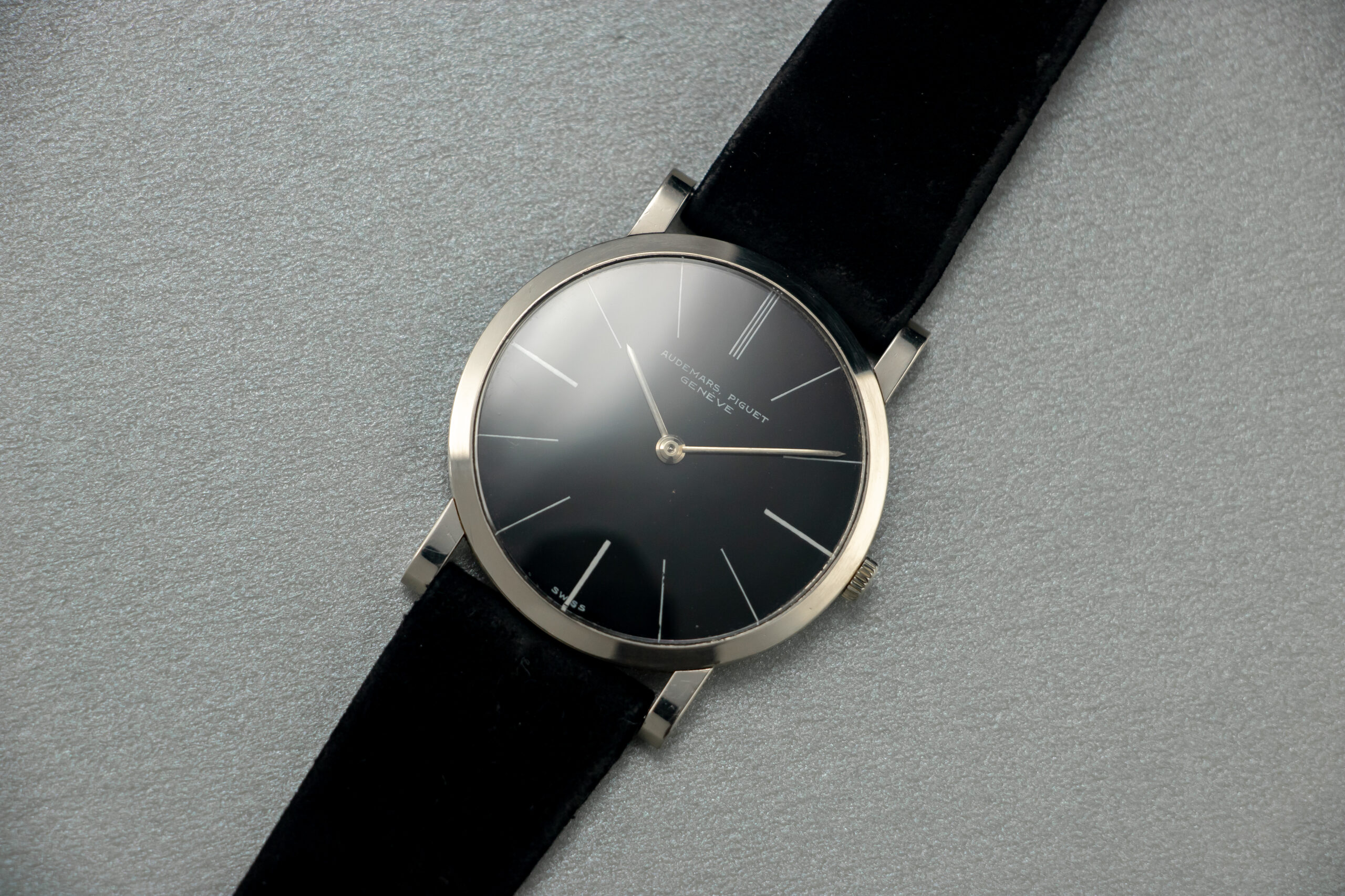 Factory original gloss black dial with white printing in good condition.  Note the small scratch between 8 and 9 o’clock.  Signed “AUDEMARS PIGUET, GENEVE, SWISS”.  Stick hands in white gold.