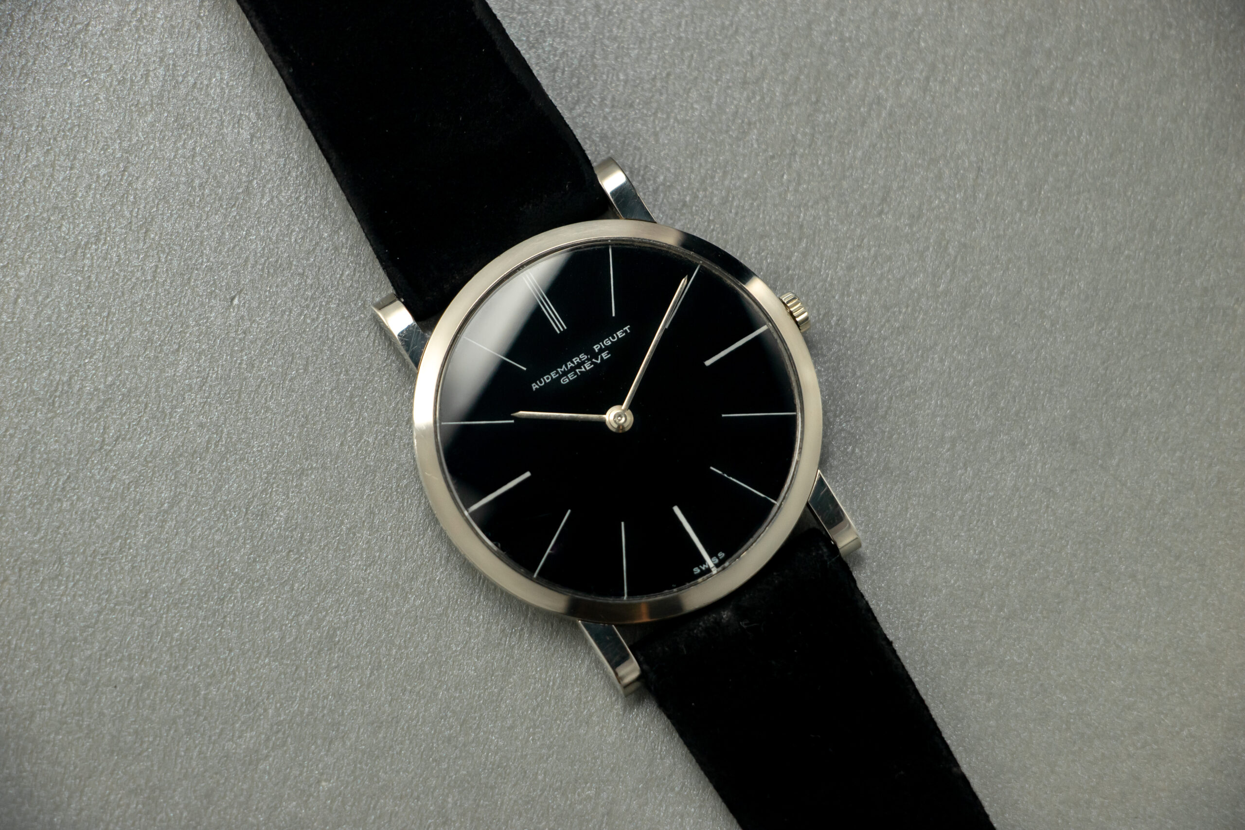 A fine and rare gents Audemars Piguet reference 5043BC wrist watch with factory original black dial, circa 1967.  Collectors of vintage AP will note that remarkably few pre-Royal Oak era watches were equipped with black dials from the factory, and fewer were produced in white metal relative to yellow, making this watch a very special and rare example.  The 18kt white gold case measures 32mm excluding the original unsigned crown and has been exceptionally well preserved.