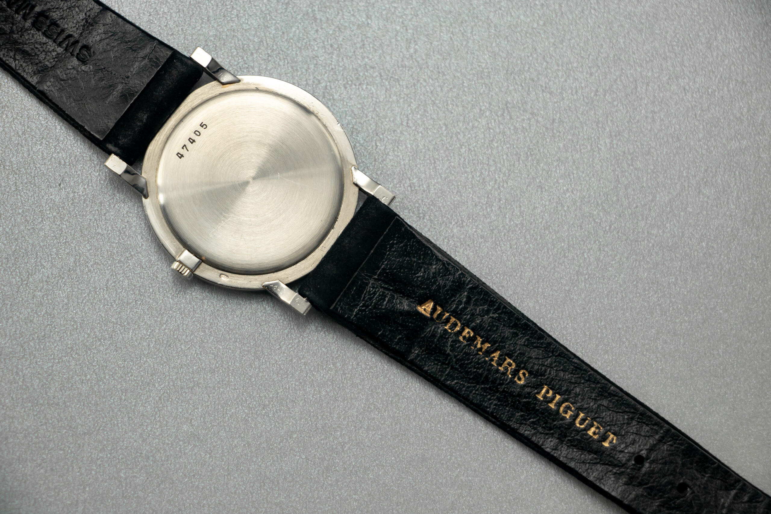 Delivered on a vintage black Audemars Piguet signed strap with modern generic steel buckle.