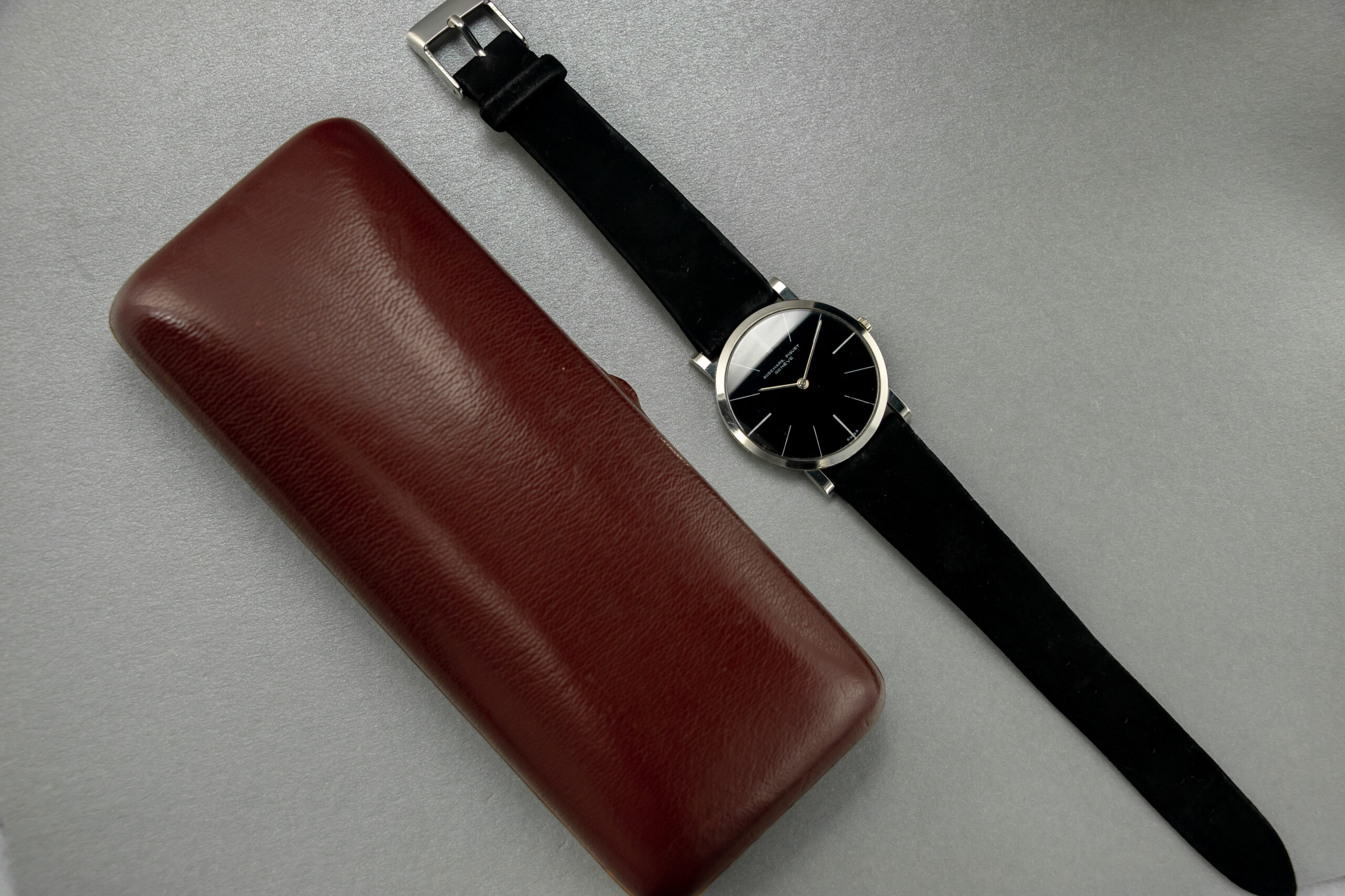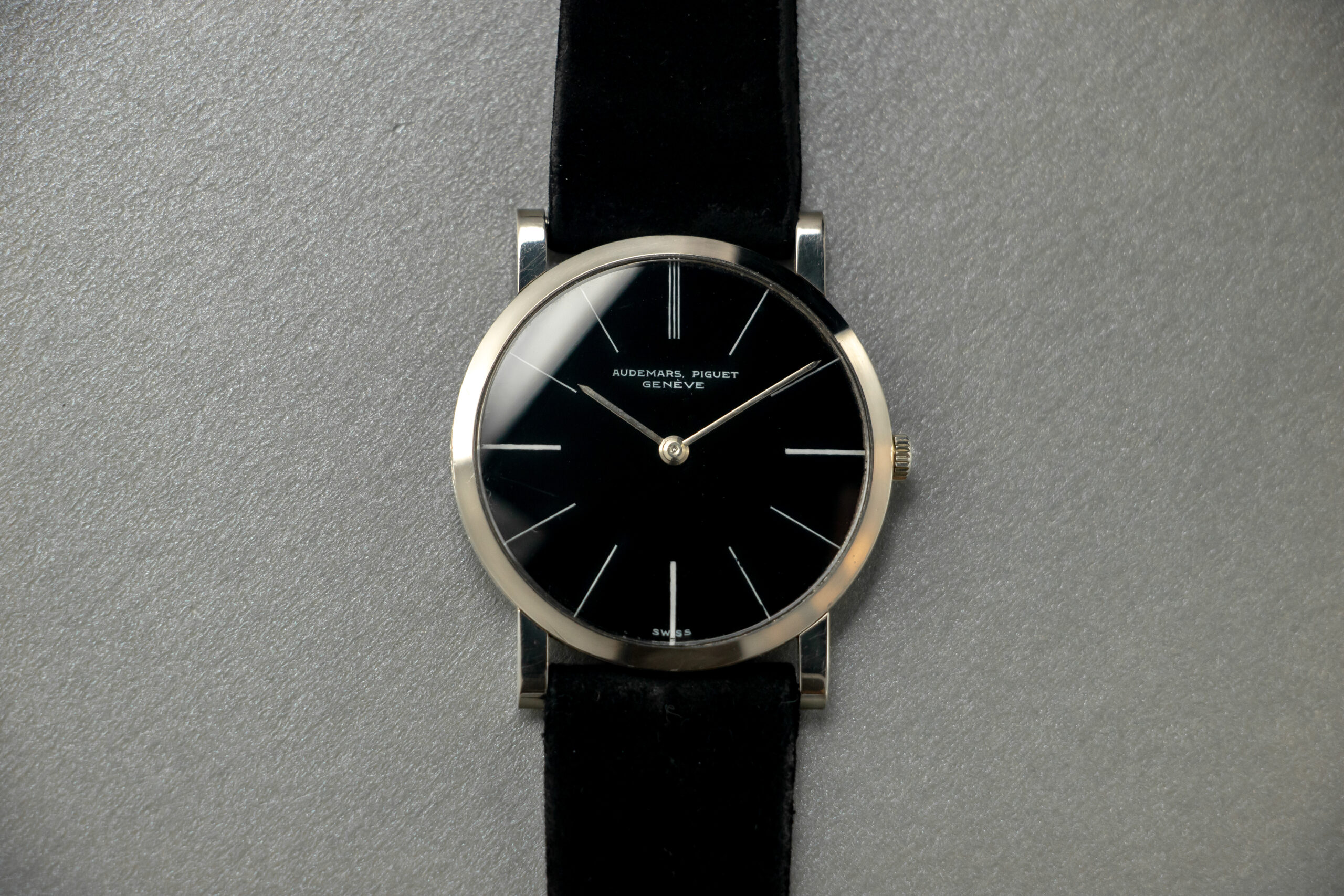 A fine and rare gents Audemars Piguet reference 5043BC wrist watch with factory original black dial, circa 1967.  Collectors of vintage AP will note that remarkably few pre-Royal Oak era watches were equipped with black dials from the factory, and fewer were produced in white metal relative to yellow, making this watch a very special and rare example.  The 18kt white gold case measures 32mm excluding the original unsigned crown and has been exceptionally well preserved.