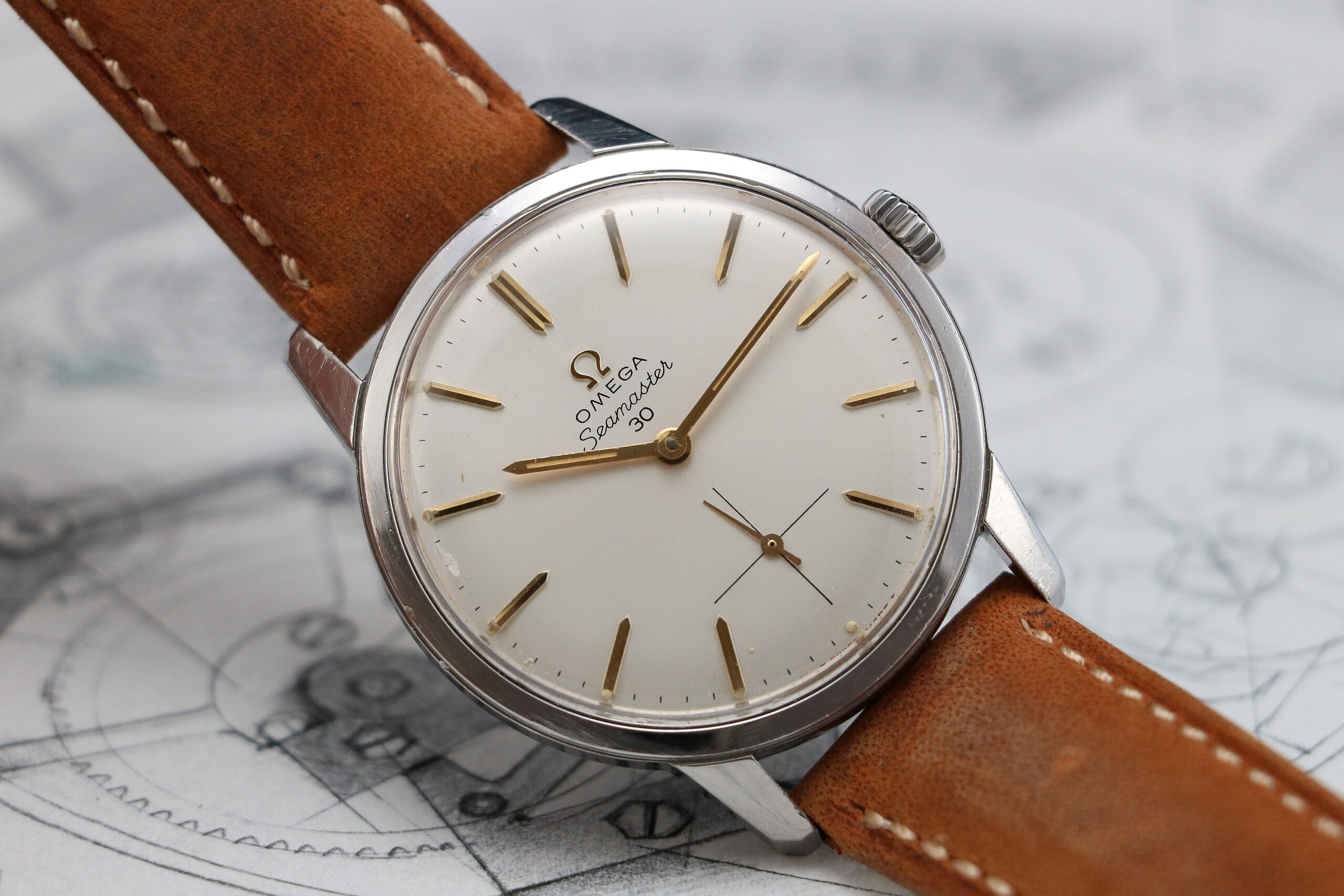 This Omega Seamaster 30 125.007 is delivered on a modern leather strap with stainless steel buckle.