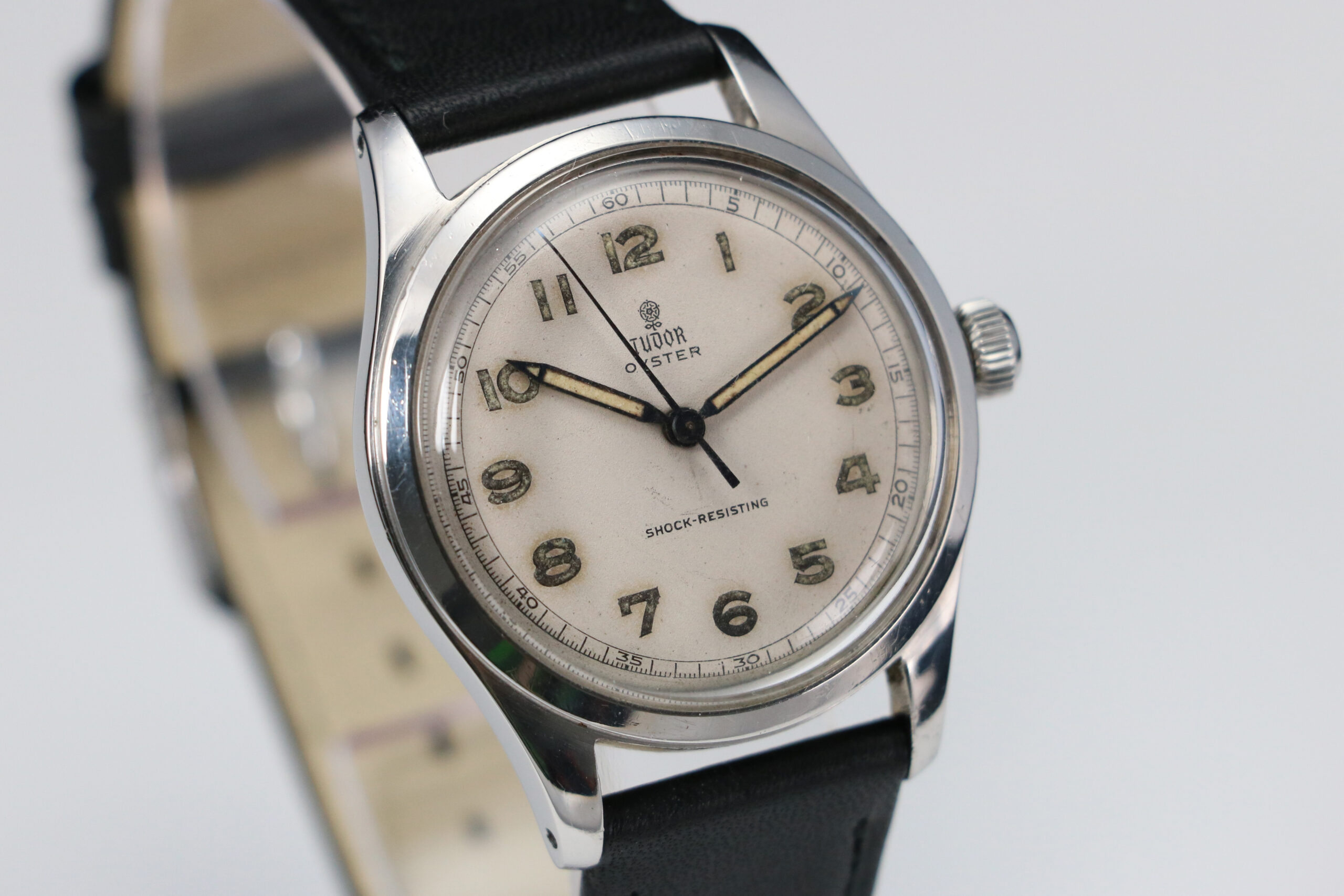 This Tudor Oyster reference 4463 is paired with a black leather strap and steel buckle.