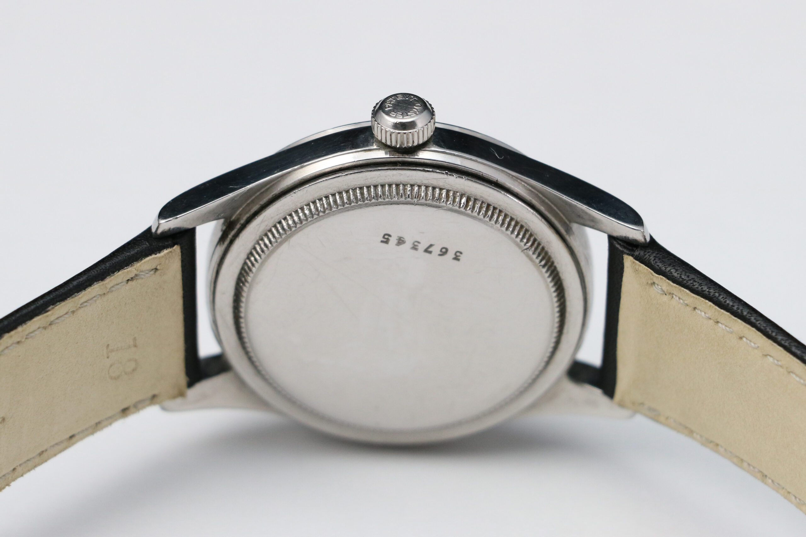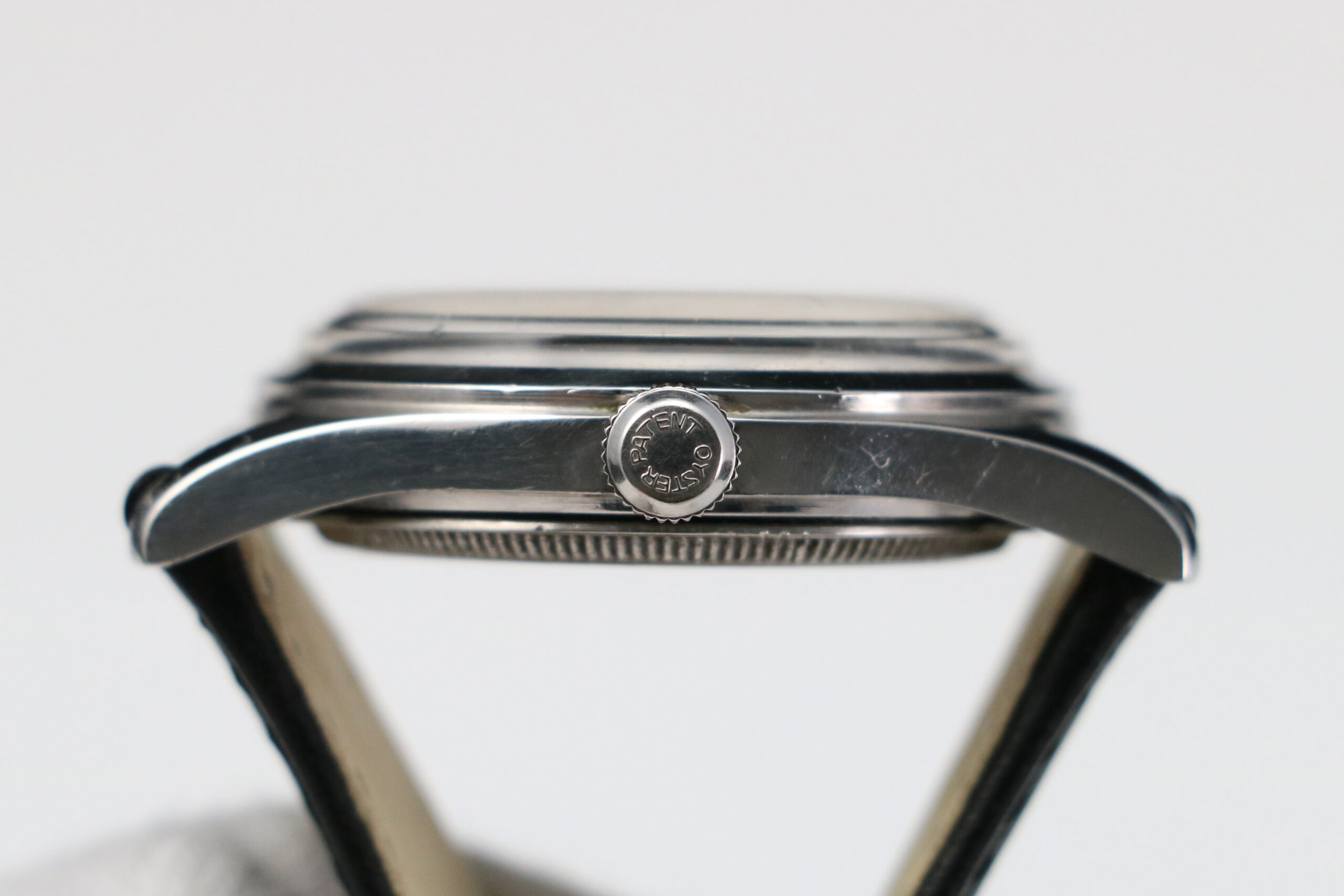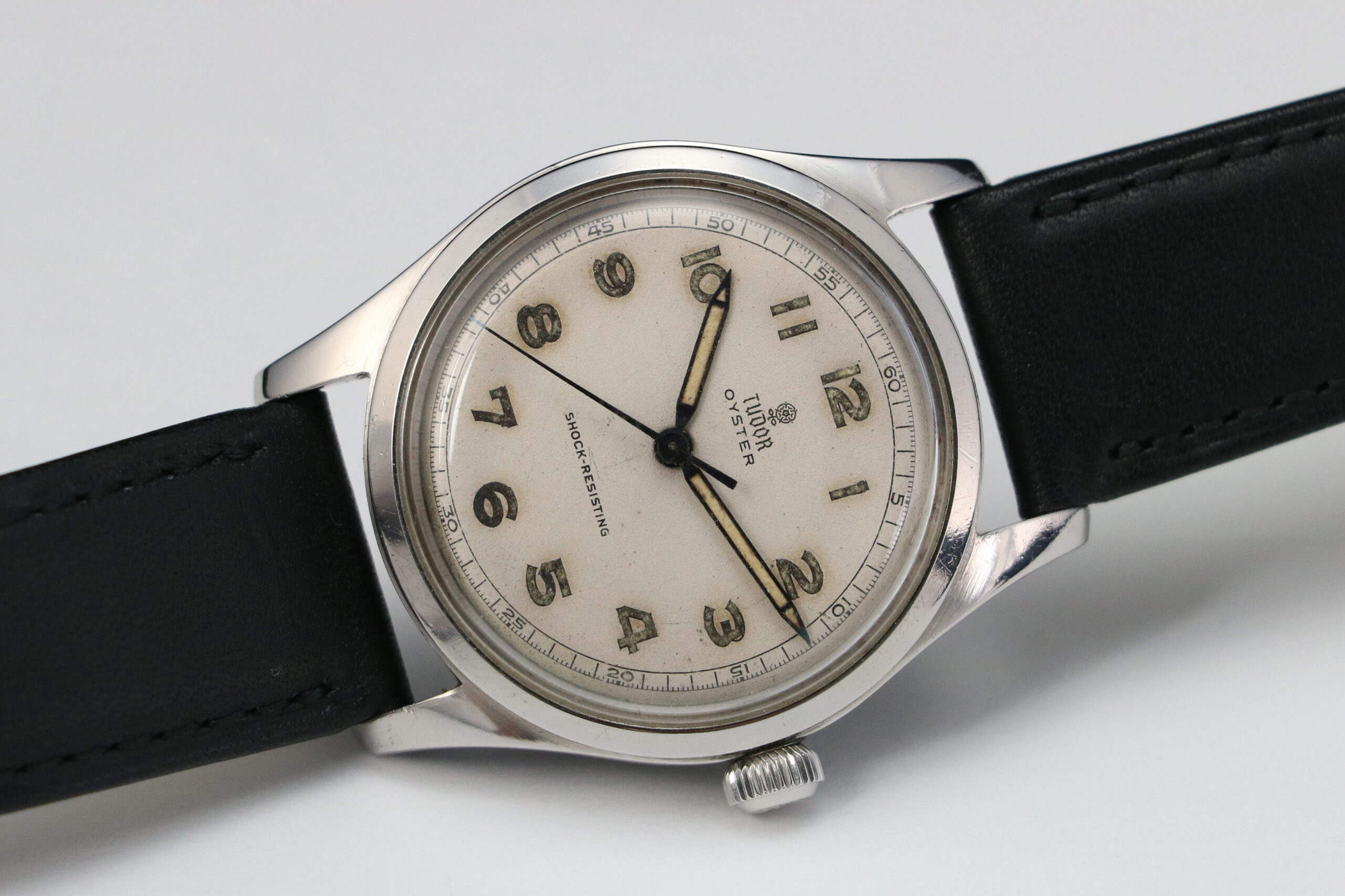 This Tudor Oyster reference 4463 is paired with a black leather strap and steel buckle.